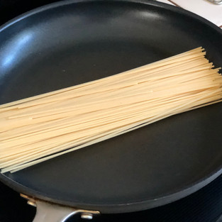 Get your pasta started by placing it in a large skillet and filling it with cold water just until it reaches slightly above the pasta. Season with a couple of generous pinches of kosher salt and turn the heat on high. Immediately set your timer for 11 minutes. As it cooks, gently separate the noodles with tongs or a fork. (*Note: This works best when cooking 8oz of pasta, or less. If you are doubling the recipe, then cook your pasta according to package directions.)