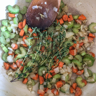 Sauté the celery, carrots, and onions in the melted butter until they start to soften.